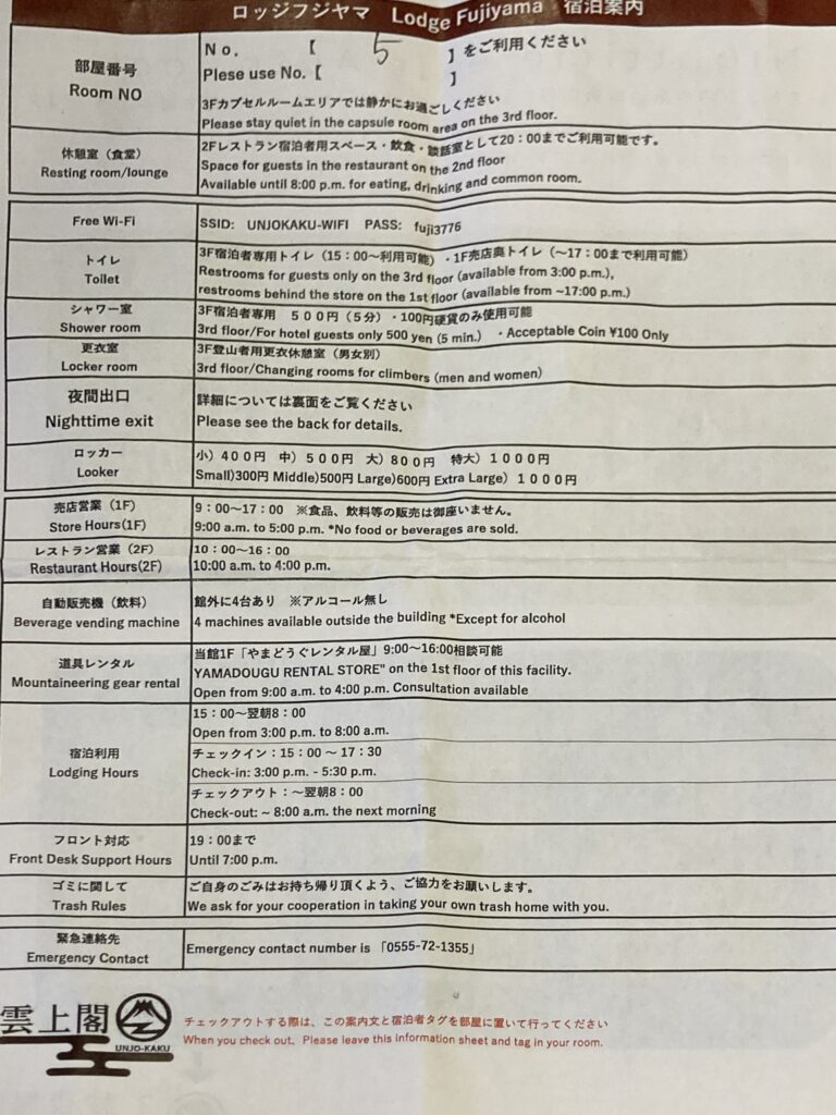 6合目より上の山小屋は通常朝夕の食事がついていますが、雲上閣はカプセルホテルで素泊まりのみですが9,500円とお安いです。それから山小屋と違い、500円でシャワーを5分浴びた後、スタートできます。