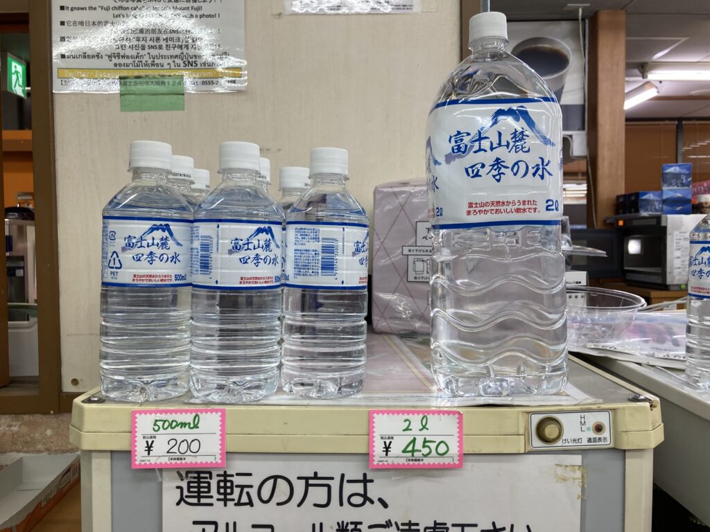 富士山に向かう前に買っておいが方がよいものはこれら装備だけではありません。それは水です。500mのペットボトルが500円、標高が上がるにつれて価格も上昇し、市販価格の3〜5倍の値段にもなります。私は今回500mのペットボトル2本を出発前にリュックの両脇に差して行きましたが、結局5合目でも2リットルの水を買い足し、最後はこれを全部飲み干しました。最初から500mペットボトル5本~6本あってもよいと思います。